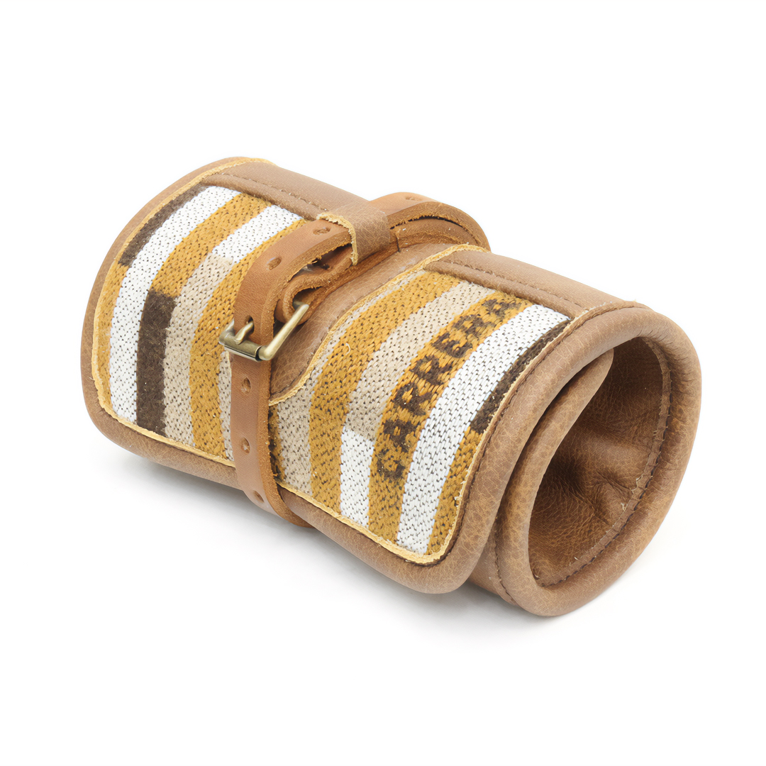 Each roll comfortably holds four watches, with a thoughtful design that accommodates both large and small dials. The unique 8-hole strap closure and solid metal buckles combine classic style with practical versatility, while the leather-bound edges showcase a commitment to enduring quality.